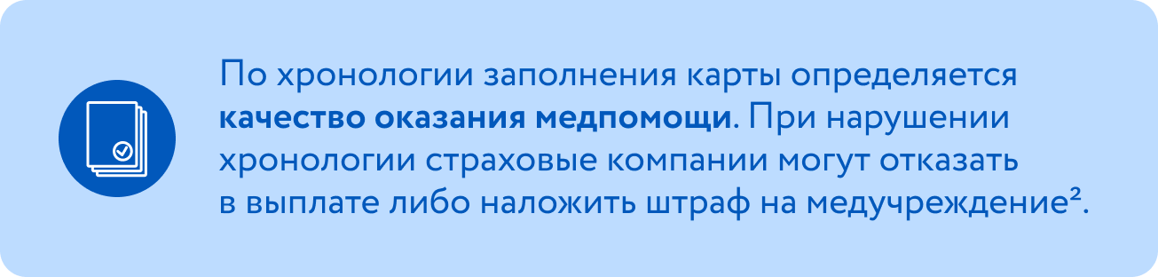 У некоторых врачей из-за сильной занятости возникает искушение заполнять медкарту не в хронологическом порядке. Но это большой риск — по хронологии заполнения карты определяется качество оказания медпомощи. И страховые компании могут воспользоваться нарушением этой хронологии, чтобы отказать в оплате либо наложить штраф на все медучреждение2.