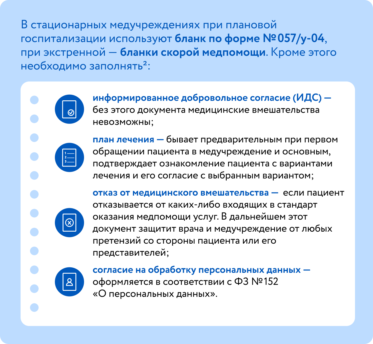 В стационарных медучреждениях при плановой госпитализации используют бланк по форме № 057/у-04, при экстренной — бланки скорой медпомощи. Кроме этого необходимо заполнять и другие бумаги2 (см. в инфографике).