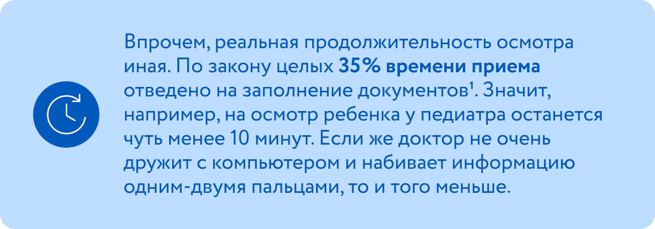 При этом вести медицинскую документацию нужно тщательно. Ошибки могут иметь значимые последствия: в случае административного или уголовного расследования эти недочеты нередко оборачиваются против врача, а страховые компании могут отказать в оплате лечения2. Как итог, работающие в государственных медучреждениях доктора вынуждены либо проводить осмотр пациентов в ритме «кавалерийского галопа» (со всеми вытекающими), либо тратить время, предназначенное для приема других пациентов, на заполнение документации, что рождает очереди.