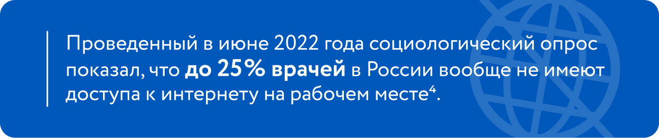 С 2021 года российские медицинские учреждения могут переходить на электронный документооборот (приказ Минздрава РФ № 947н). Минздрав наделил электронные медицинские документы правовым статусом, теперь их не обязательно дублировать в бумажном виде5. А к 2030 году, как ожидается, заработает программа Правительства РФ «Первичное звено для каждого», которая позволит врачам уделять больше времени пациентам, как полагают в Минздраве. В соответствии с программой, 100 % медицинских документов будут сразу (!) формироваться в электронном виде6.