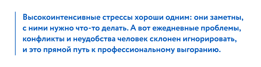 Вы знали, что в копилку эмоционального выгорания свой вклад вносят такие мелочи, как незавершенные рабочие дела? Мысли о работе 一 переживание конфликта с начальством, какой-то несправедливости или тяжелого разговора с неизлечимо больным пациентом 一 во время, предназначенное для отдыха, тоже приводят к хронической усталости6. Ученые связывают это с тем, что нервная система не отдыхает, восстанавливается хуже, в результате копится усталость и может наступить нервное истощение.