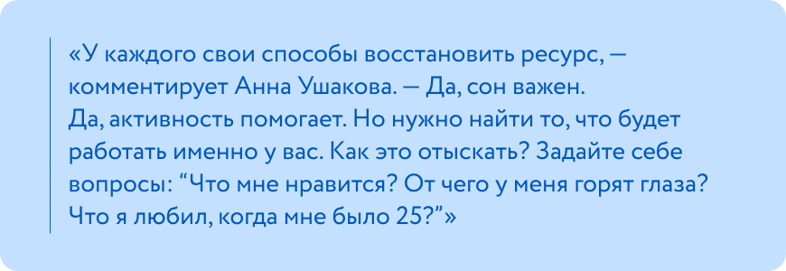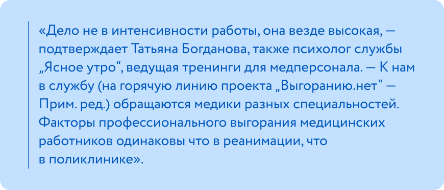 К слову, наибольший риск выгорания у тех, кто предъявляет к себе непомерно высокие требования и идеализирует профессию8.