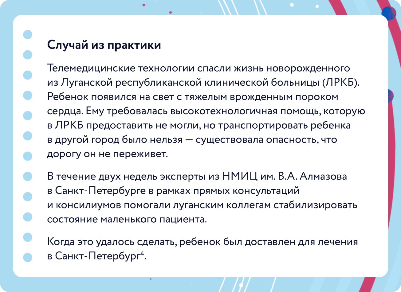 Телемедицинские технологии вывели взаимодействие врачей на качественно новый уровень, соединяя специалистов, находящихся за тысячи километров друг от друга. Вот уже более пяти лет пациенты из разных уголков России имеют право получать помощь ведущих экспертов страны в рамках федеральных телемедицинских консилиумов. Это стало возможным с выходом в 2017 году ФЗ«О внесении изменений в отдельные законодательные акты Российской Федерации по вопросам применения информационных технологий в сфере охраны здоровья»1.